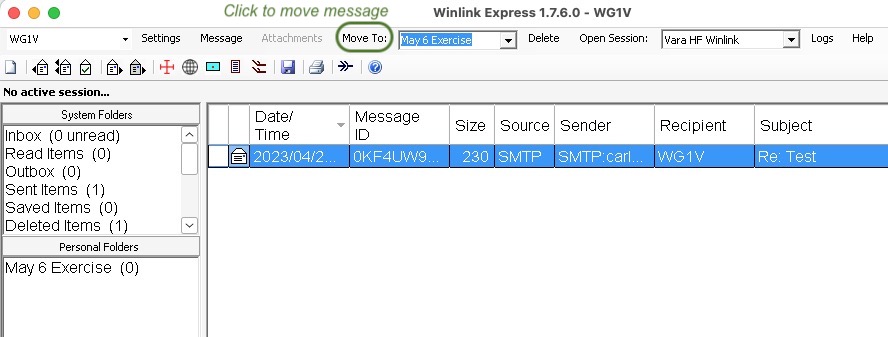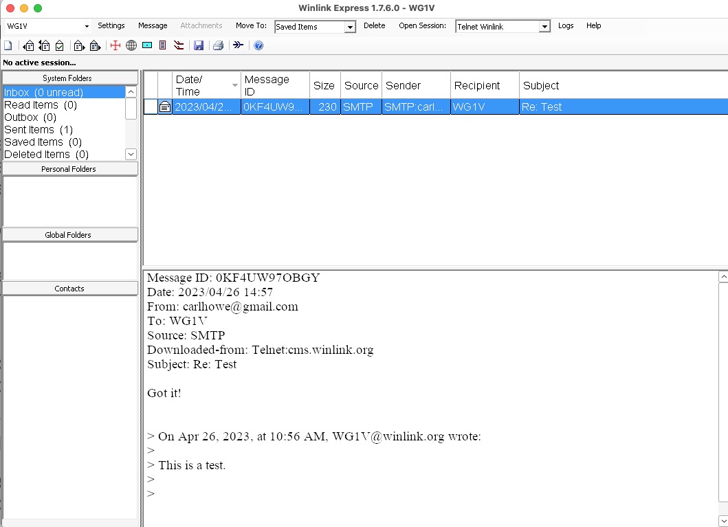 Once all the queued messages have been sent and received, VARA will stop transmitting and return you to the session window. You can then close that window by clicking the X at the top right of the window and go back to the Winlink home window.