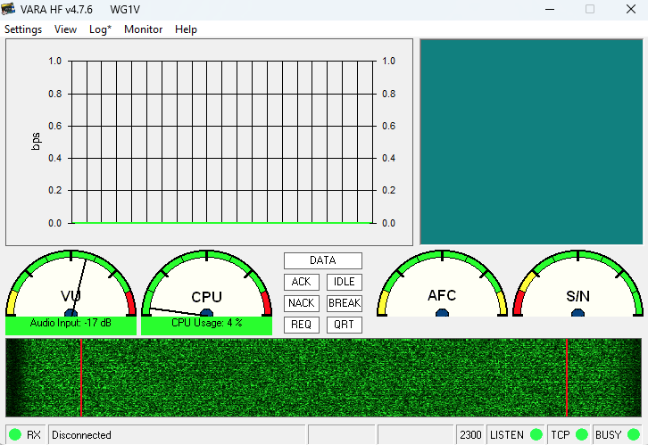 If your installation has been configured for to display it, a VARA user interface window (see Figure 15). This window allows you to set the audio inputs and levels and monitor the data transmission in real time. If this window doesn’t appear automatically, you can make it visible by clicking on the VARA icon in the Windows window tray.