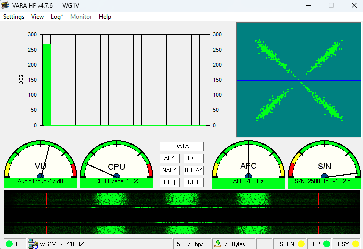 When a connection gets made, the VARA UI window will begin displaying performance information about the connection as shown in Figure 21. The connection shown is receiving data at about 270bps, which is fairly throughput on 2.3 KHz SSB channels. Good channel conditions can cause VARA to “upshift” to faster speeds using more subcarriers, but that’s only likely to happen when you have a large number of messages or large data attachments being sent.