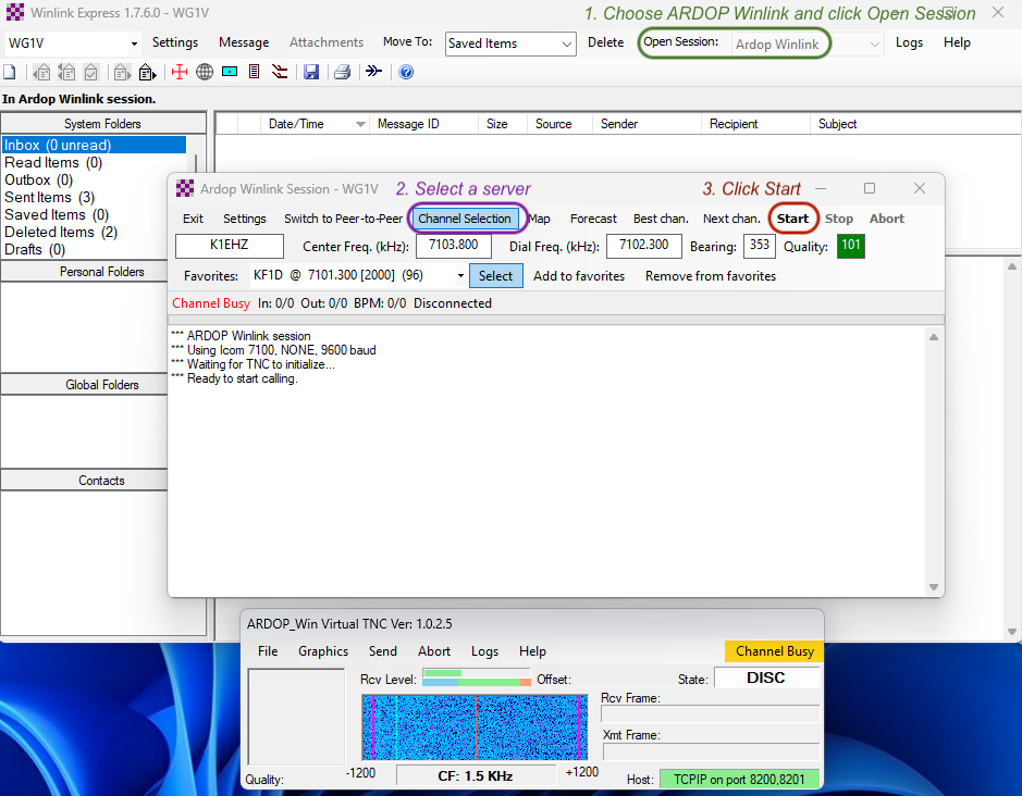 To actually send and receive messages, we must connect to a Winlink server for email transfer. To do this, we need to: