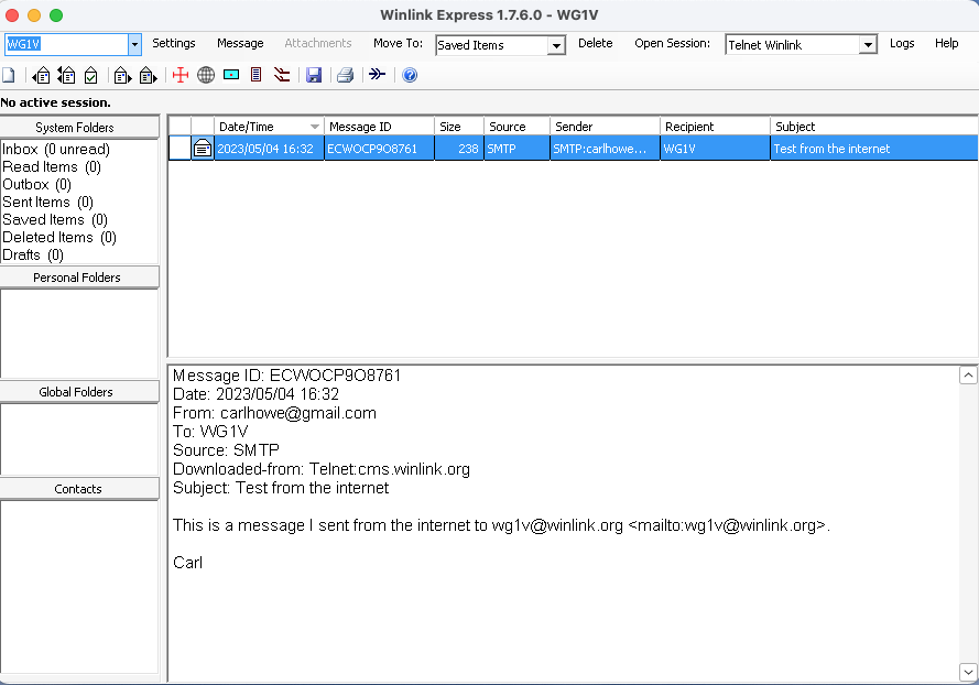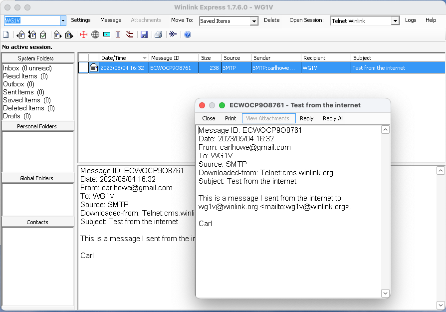 Regardless of how you connected to the Winlink servers, messages addressed to your callsign will show up in your Winlink Inbox. Figure 23 shows what an ordinary text message from the Internet looks like when it arrives in Winlink.
