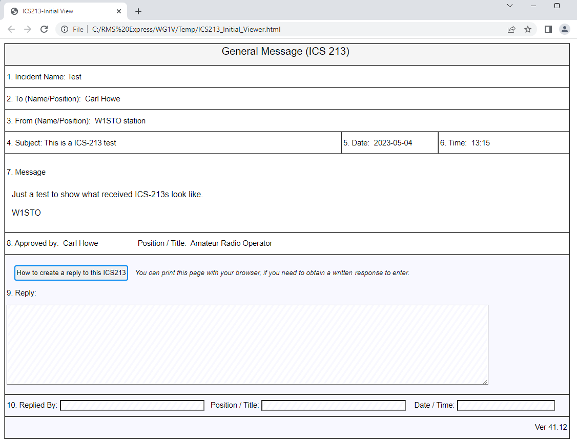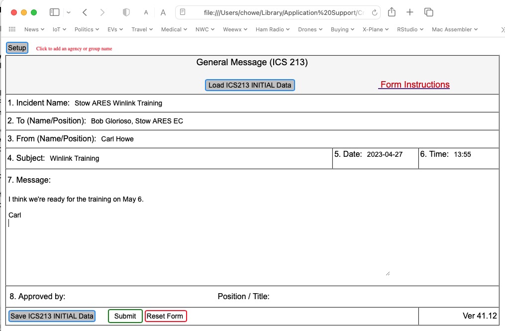 Your click on the ICS213 template will open the form in your computer’s web browser and provide fields into which you can type. Figure 8 shows such a form with the fields filled in.