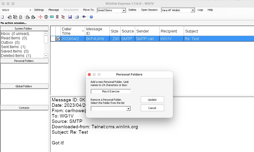 First, create a new folder in which to store the message by right-clicking in the Personal Folders pane of the Winlink home window. That will bring up a dialog box into which you can type the name of your new folder as shown in Figure 26.
