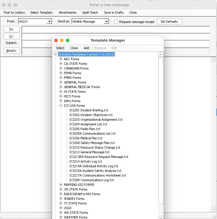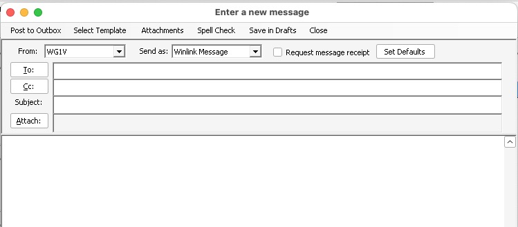 Create messages in Winlink offline and post them to your Outbox. When you have traffic to send, you can create simple text messages or structured messages using predefined forms such as the FEMA form ICS-213 directly within the Winlink program.