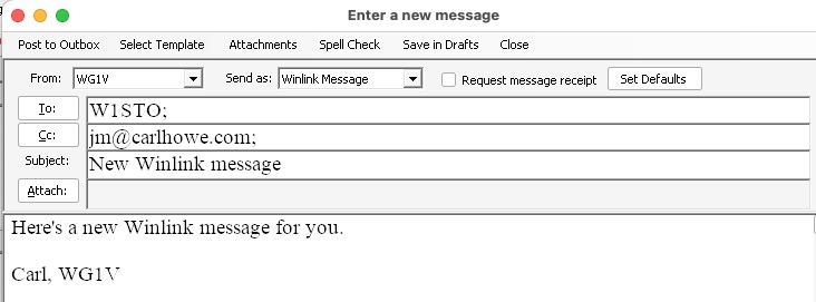 Fill in the callsigns of other Winlink users you want to send your message to in the To: and Cc: fields. Callsigns are terminated by semicolons; if you don’t type one, Winlink will insert it for you. You can also add internet addresses in standard internet email notation as shown in Figure 6 below.