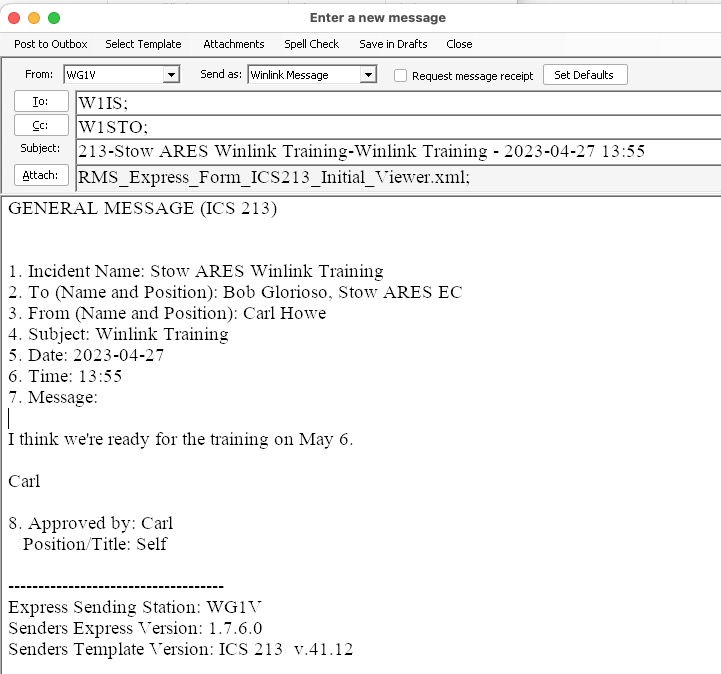 To queue up the ICS213 message for transmission, click on Post to Outbox in the message window. You’ll then be returned to the Winlink home screen.